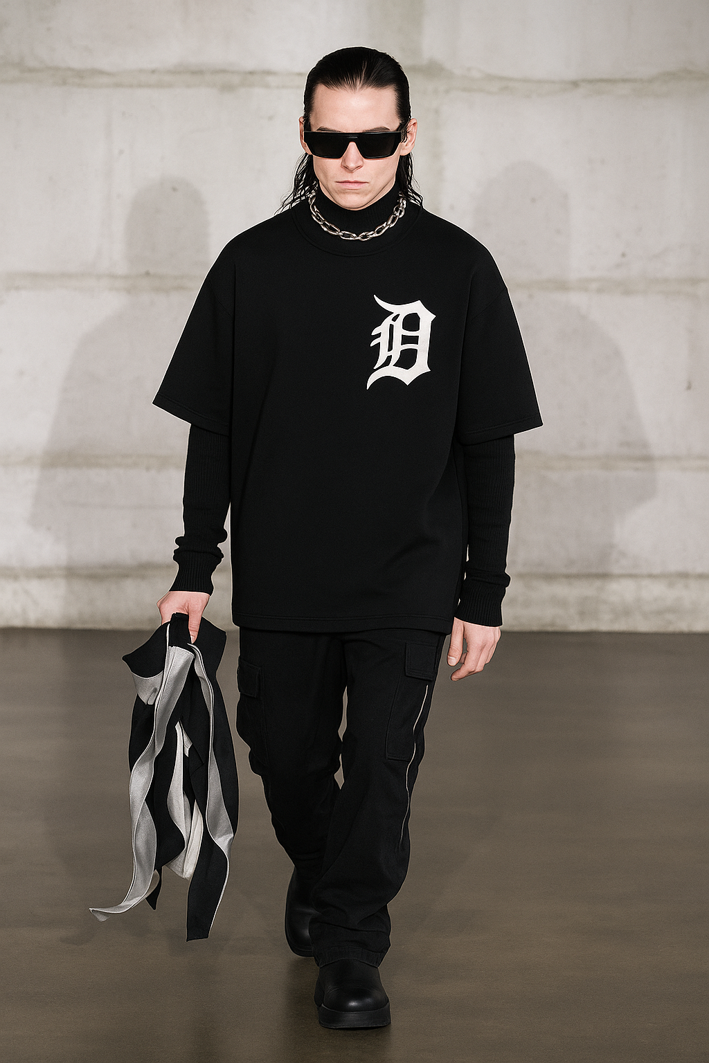 This oversized DEADRIOT T-shirt features a bold iconic-logo chest print in crisp white, contrasted against deep black cotton. Layered effortlessly over a long-sleeve shirt, the look plays with proportion and texture while maintaining a monochrome palette. A versatile piece that bridges streetwear clarity and minimal edge.